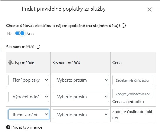 - Kliknutím na [+ Přidat] zvolte výpočet měřením, manuální zadání nebo pevný poplatek