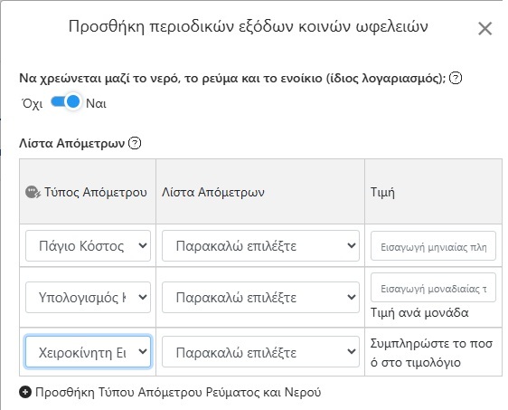 - Κάντε κλικ στο [+ Προσθήκη] για επιλογή μεταξύ μέτρησης μετρητή, χειροκίνητης εισαγωγής, σταθερού κόστους