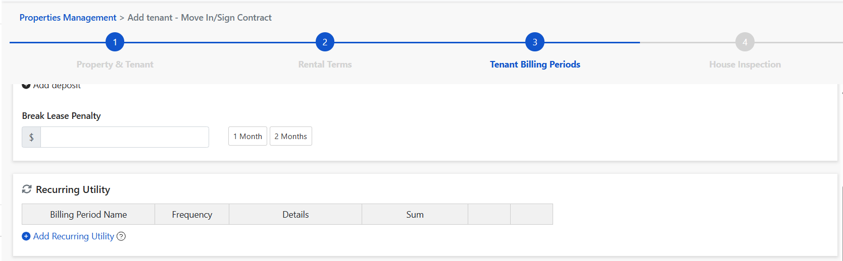 When you Add Move-in/Sign Lease, the Recurring Utilities Billing Group screen appears. Click + Add Recurring Utilities Billing Group to start.