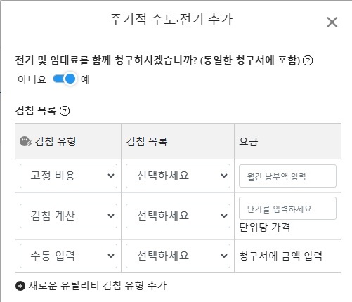 - [+ 새로 추가] 클릭 시 검침 계산, 수동 입력, 고정 비용 선택 가능