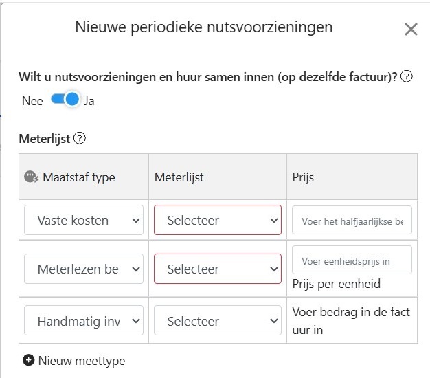 - Klik op [+ Nieuw] om te kiezen uit meteropname, handmatige invoer, vaste kosten