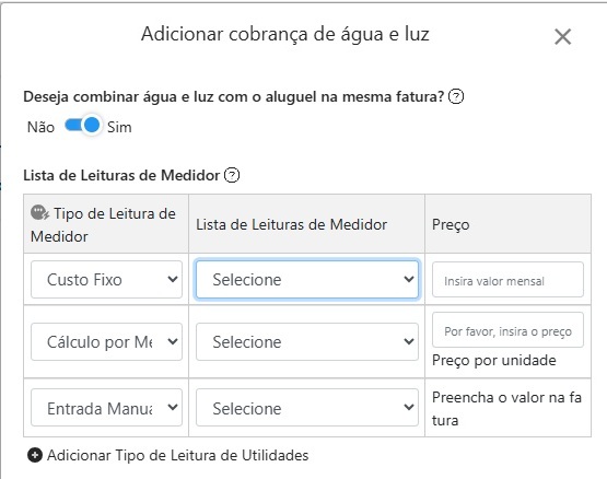 - Clique em [+ Adicionar], escolha entre leitura de medidor, entrada manual, taxa fixa