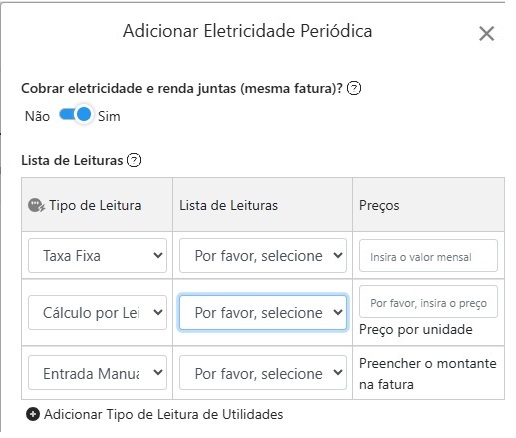 Aplicável para eletricidade, água, gás, etc., onde é necessário inserir leituras a cada período.