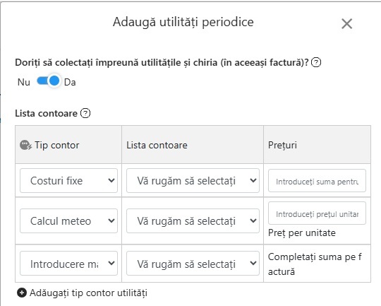 - Apasă [+ Adaugă nou], poți alege Citire contor, Introducere manuală, Taxă fixă