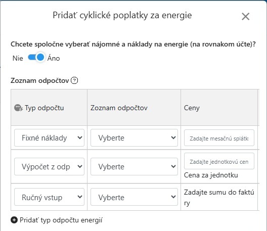 Pre spotrebu elektriny, vody, plynu s potrebou zadať odčítanie každé obdobie.