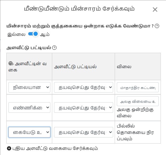 - [+ புதிதாக சேர்க்க] கொடுக்கூடிய பின்வருமாறு தேர்ந்தெடுக்கலாம்: மீட்டர் கணக்கீடு, கருவி உள்ளீடு, நிரந்தர கட்டணம்
