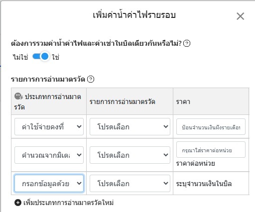 - กด [+ เพิ่ม] สามารถเลือกการคำนวณแบบมิเตอร์ กรอกด้วยตนเอง หรือค่าใช้จ่ายคงที่