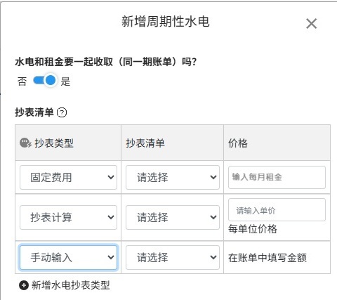 - 点击[+ 新增],可选择抄表计算、手动输入、固定费用