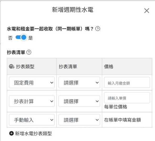 - 點選[+ 新增],可選擇抄表計算、手動輸入、固定費用
